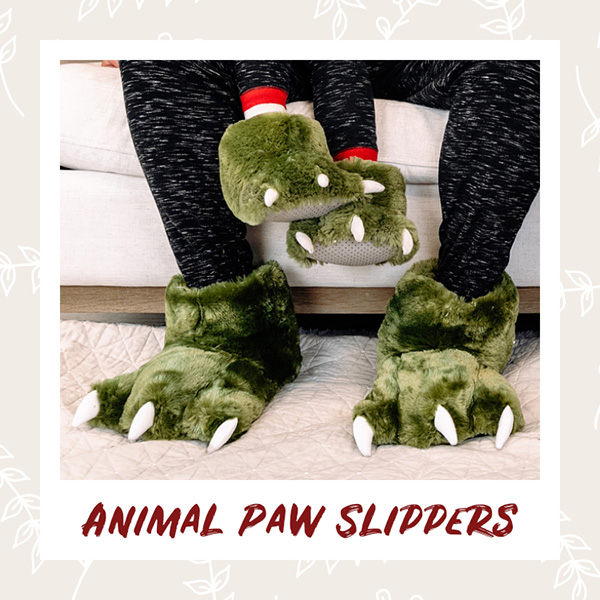 FURRY PAWS: For the young at heart, these comfy furry dinosaur slippers are a funny and goofy way to relax at the end of the day. Funny slippers aren’t just for kids. Adults deserve to have fun too, and you surely will when you wear these fluffy animal paws.