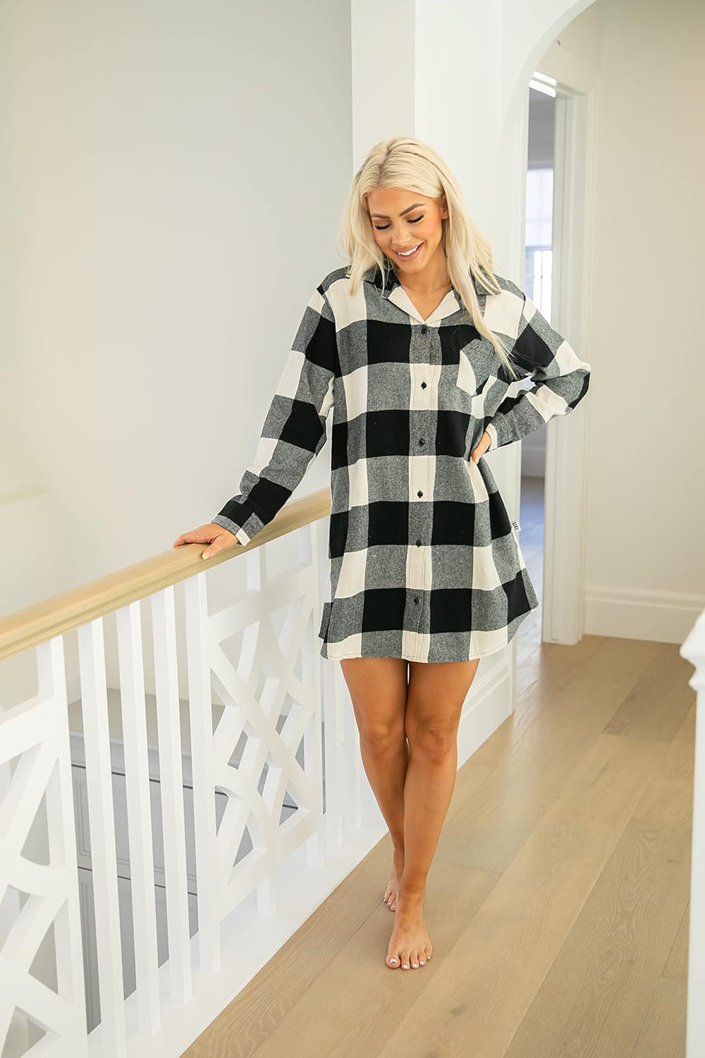 Lazy One Button-Up Sleep Shirt, Flannel Nightshirts for Women, Cute Plaid Designs(Truck Plaid Button Down)