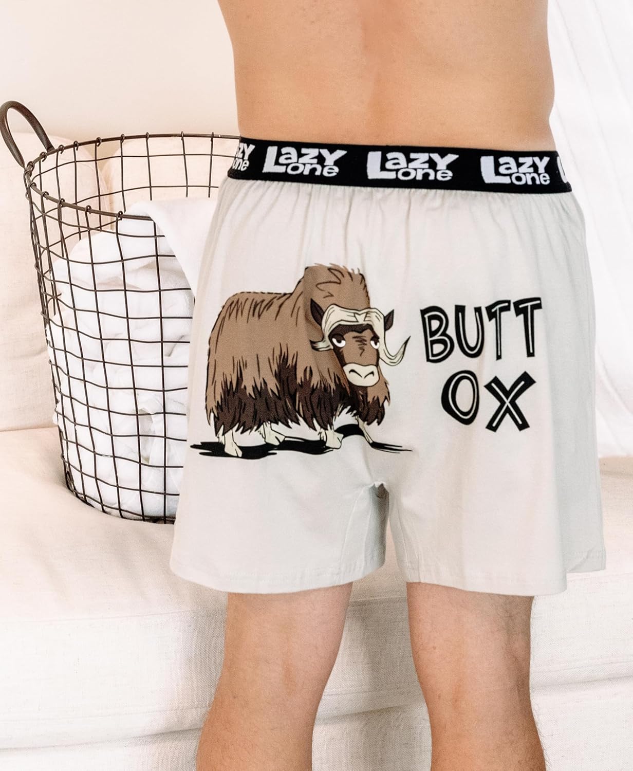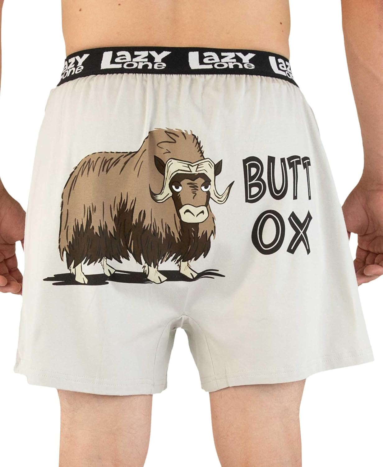 Lazy One Funny Animal Boxers, Humorous Underwear, Novelty Boxer Shorts, Gag Gifts for Men(Butt Ox Grey Boxers)