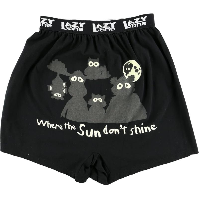 Lazy One Funny Animal Boxers, Novelty Boxer Shorts, Gag Gifts for Men, Humorous Underwear for Men(Black Where the Sun Don't Shine! Boxers)