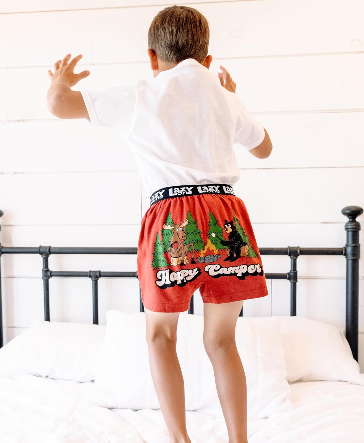 Lazy One Funny Animal Boxers, Novelty Boxer Shorts, Hunorous Kids' Underwear, Gag Gifts for Boys(Happy Camper Kids Boxer Red)