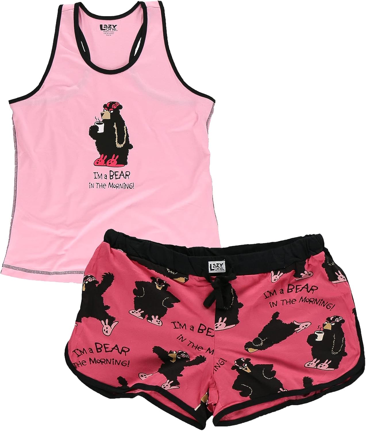 Lazy One Matching Pajamas for Women, Cute Pajama Shorts and Tank Top Set, Animal (Bear in The Morning, Medium)