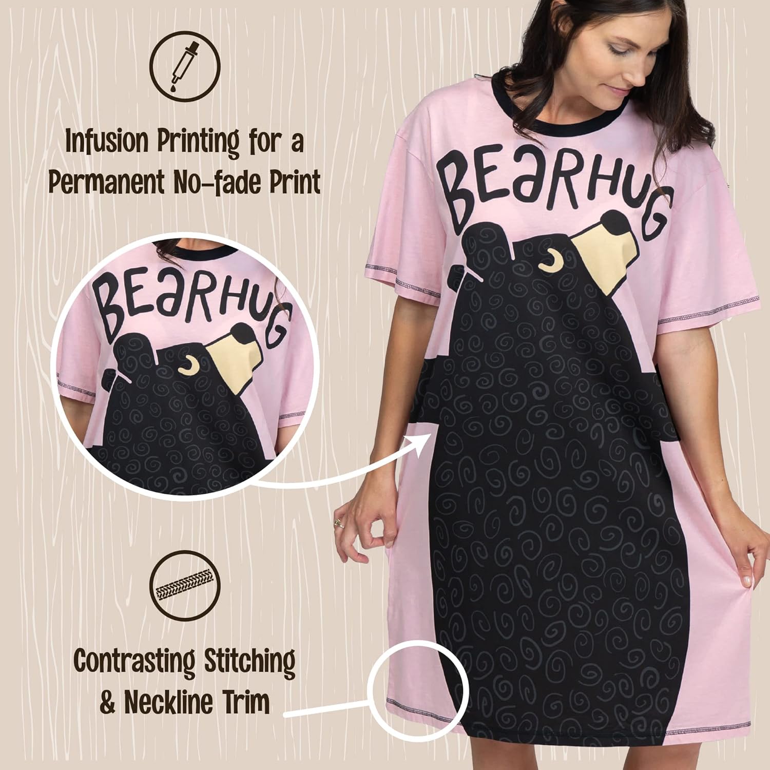 Lazy One Nightshirts for Women, Cute Nightgown for Women, Animal Designs(Light Pink Bear Hug Pink Nightshirt)