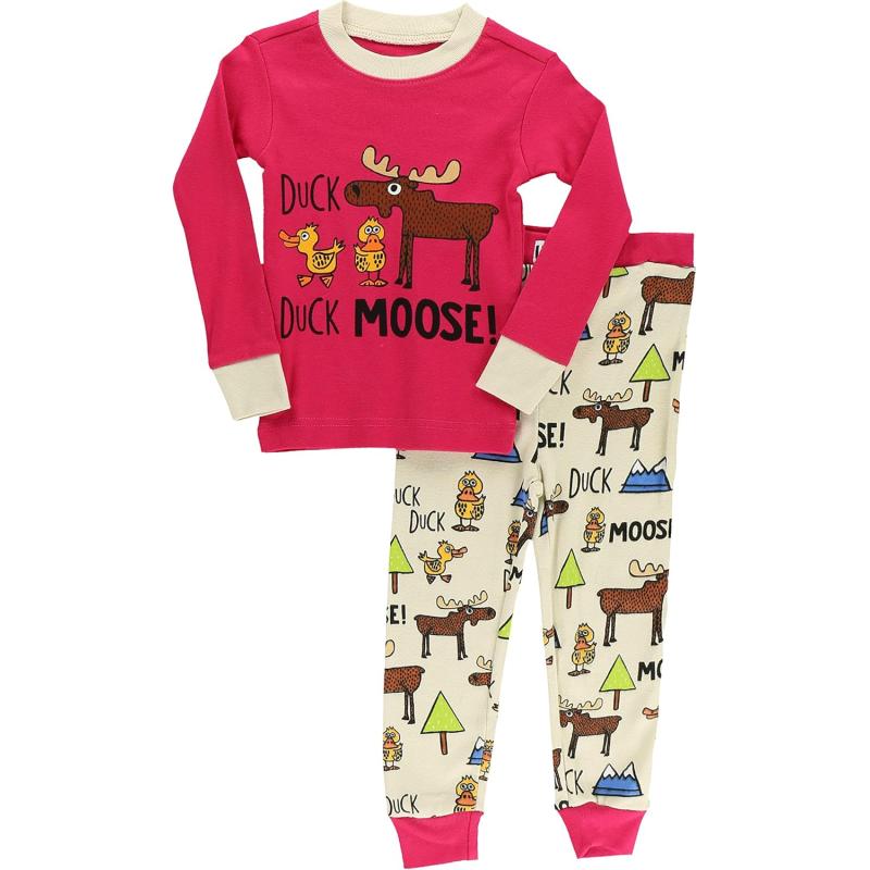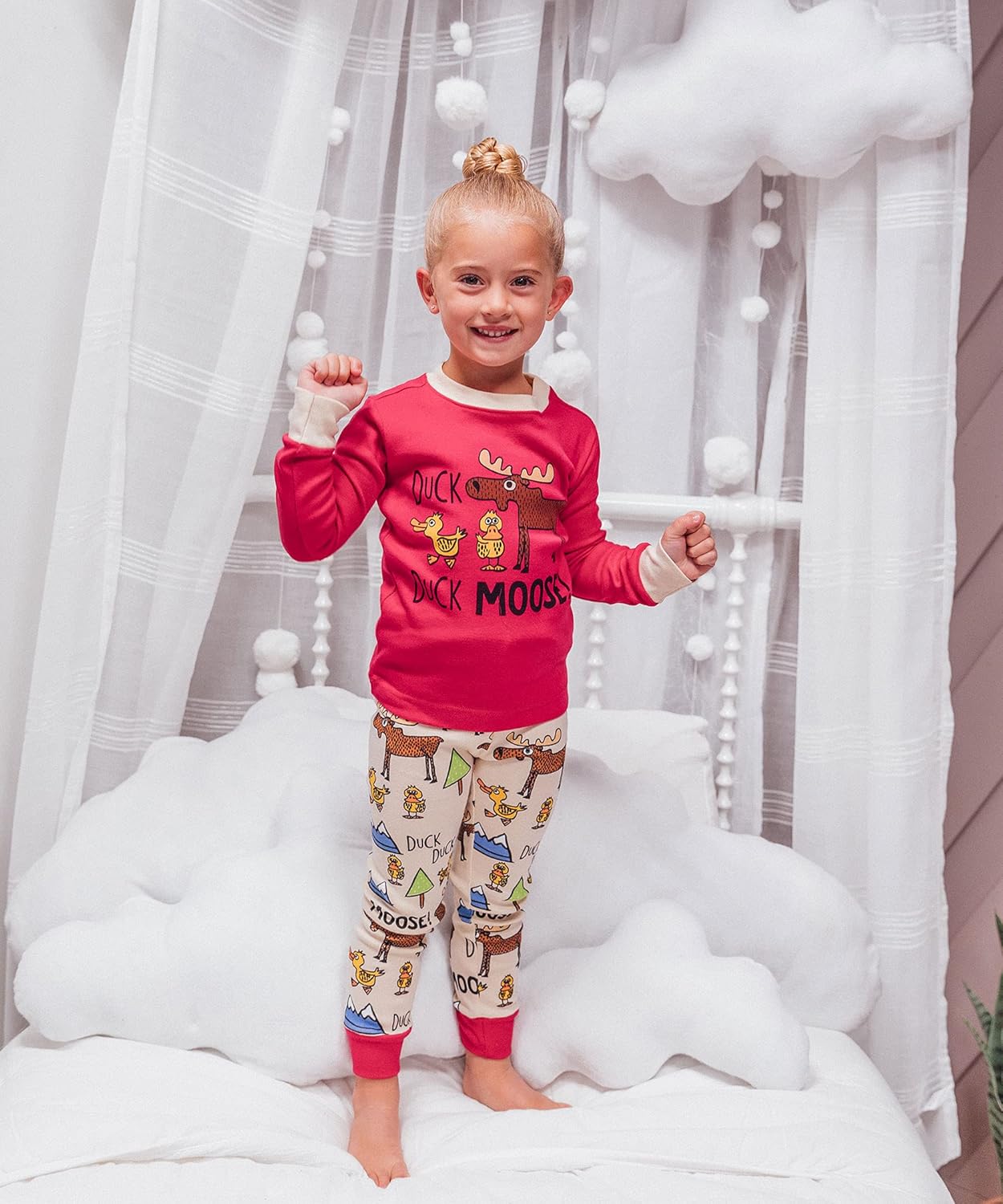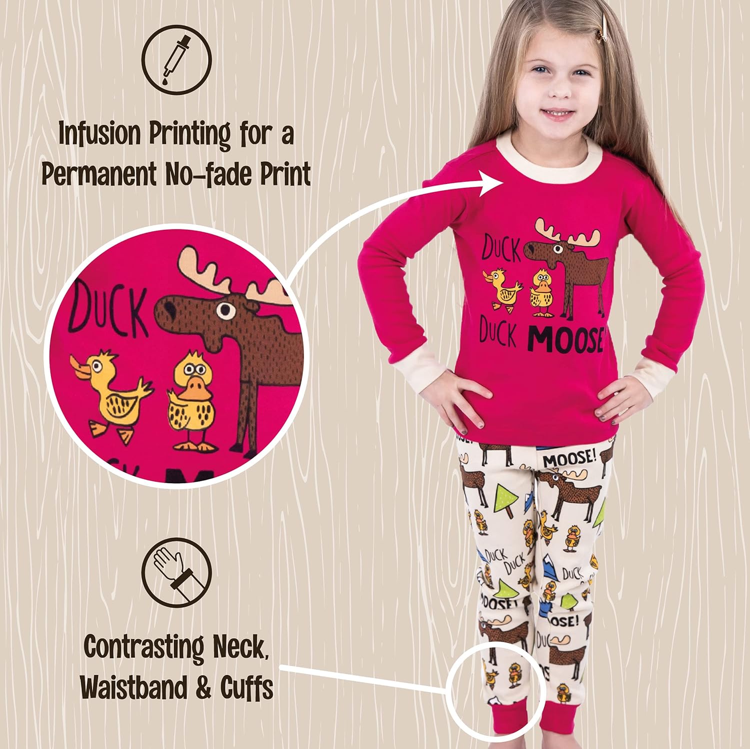 Lazy One Warm Long-Sleeve PJ Sets for Girls and Boys, Cozy, Comfy, Funny Kids' Pajama Sets, Animal, Bear & Moose(Duck Duck Moose Girl Pink Pajama Sets)