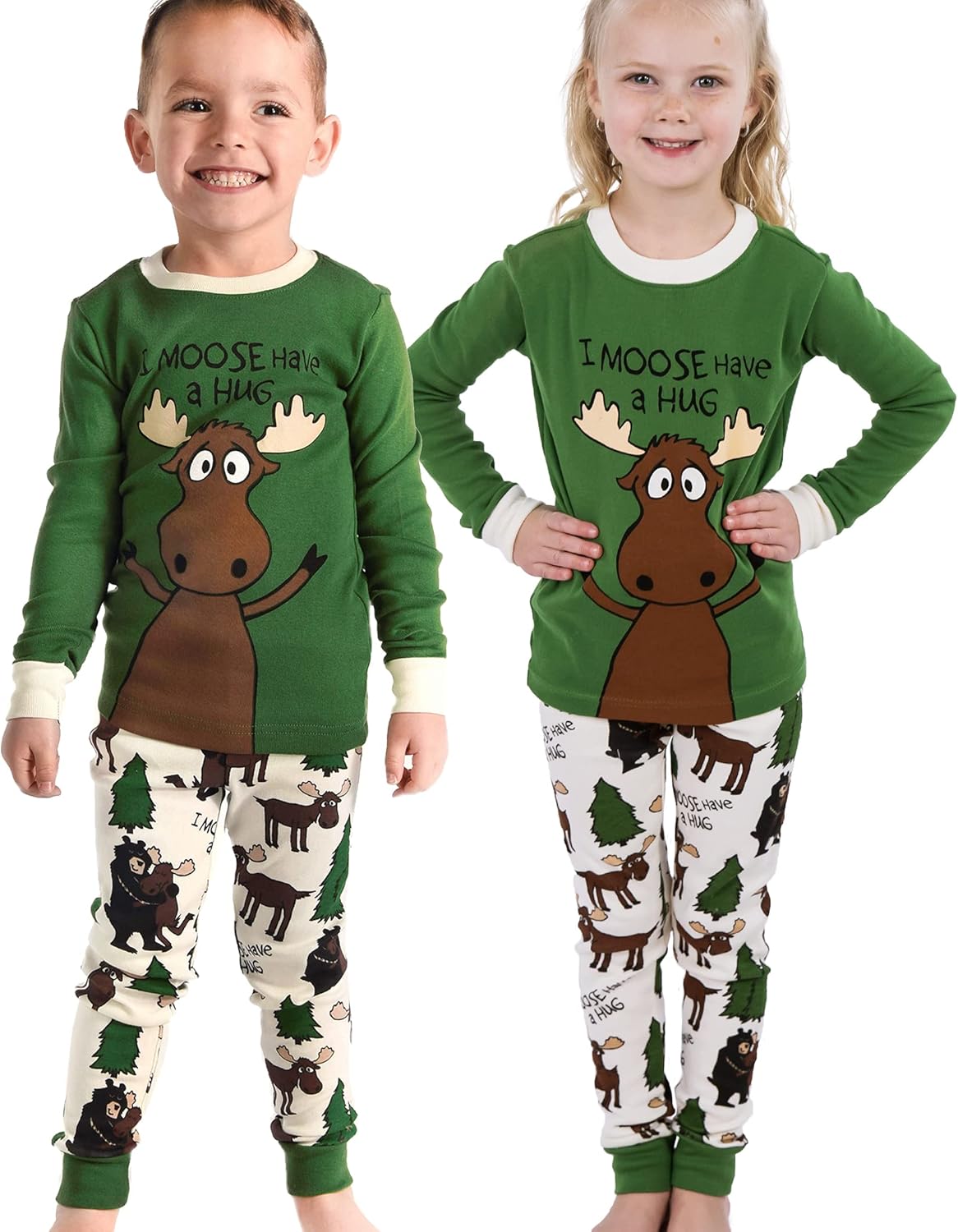 Lazy One Warm Long-Sleeve PJ Sets for Girls and Boys, Cozy, Comfy, Funny Kids' Pajama Sets, Animal, Bear & Moose(I Moose Have a Hug Green Pajama Sets)