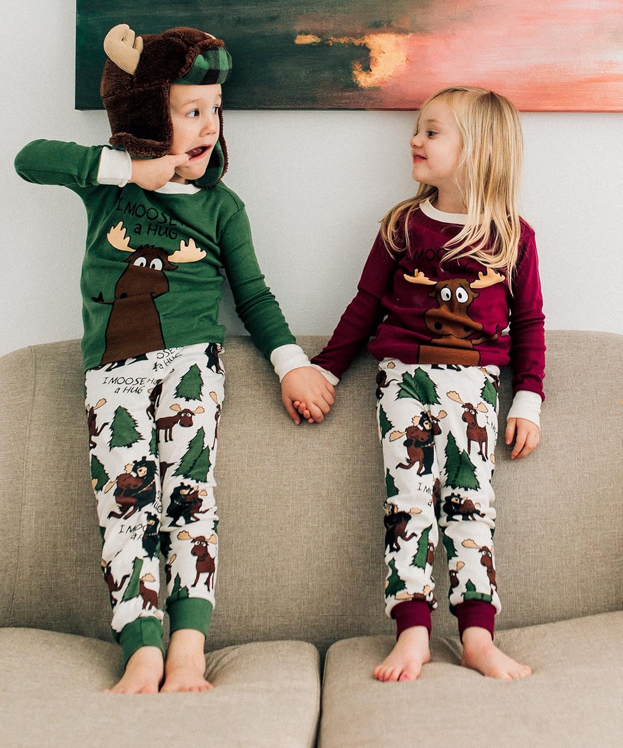 Lazy One Warm Long-Sleeve PJ Sets for Girls and Boys, Cozy, Comfy, Funny Kids’ Pajama Sets, Animal, Bear & Moose(I Moose Have a Hug Green Pajama Sets)