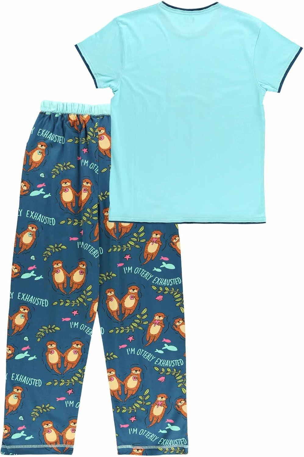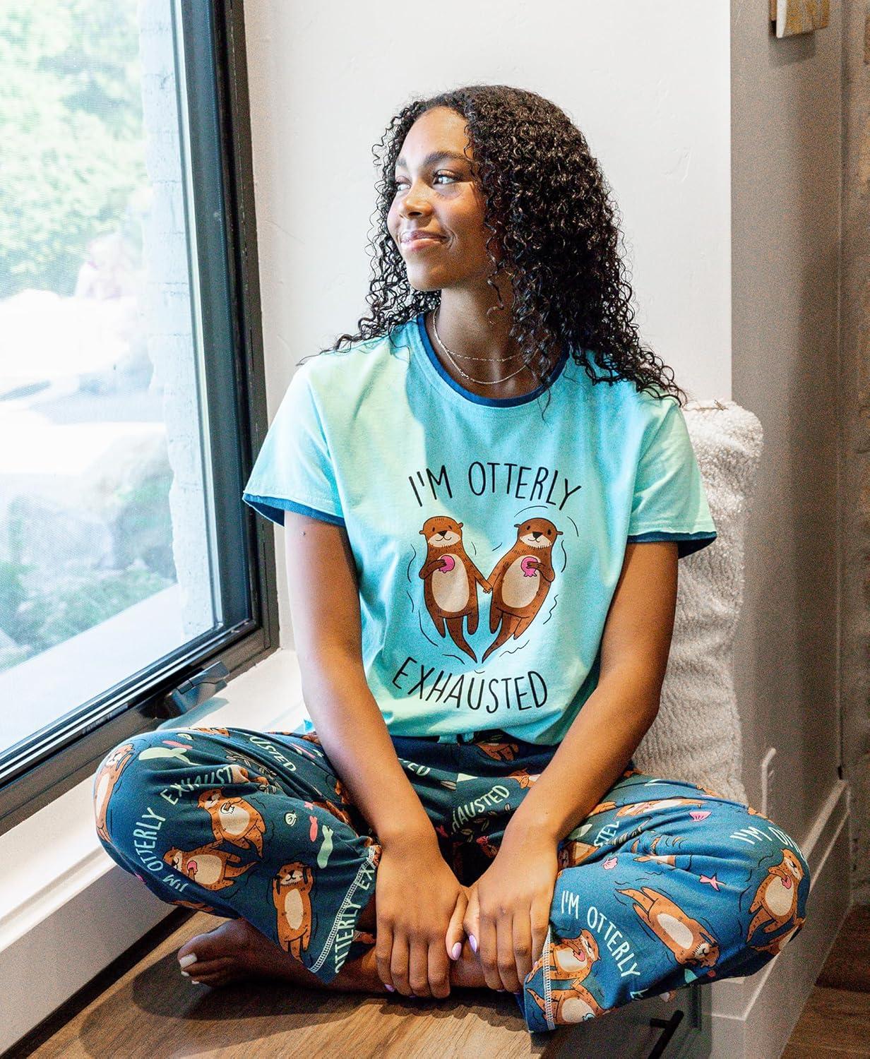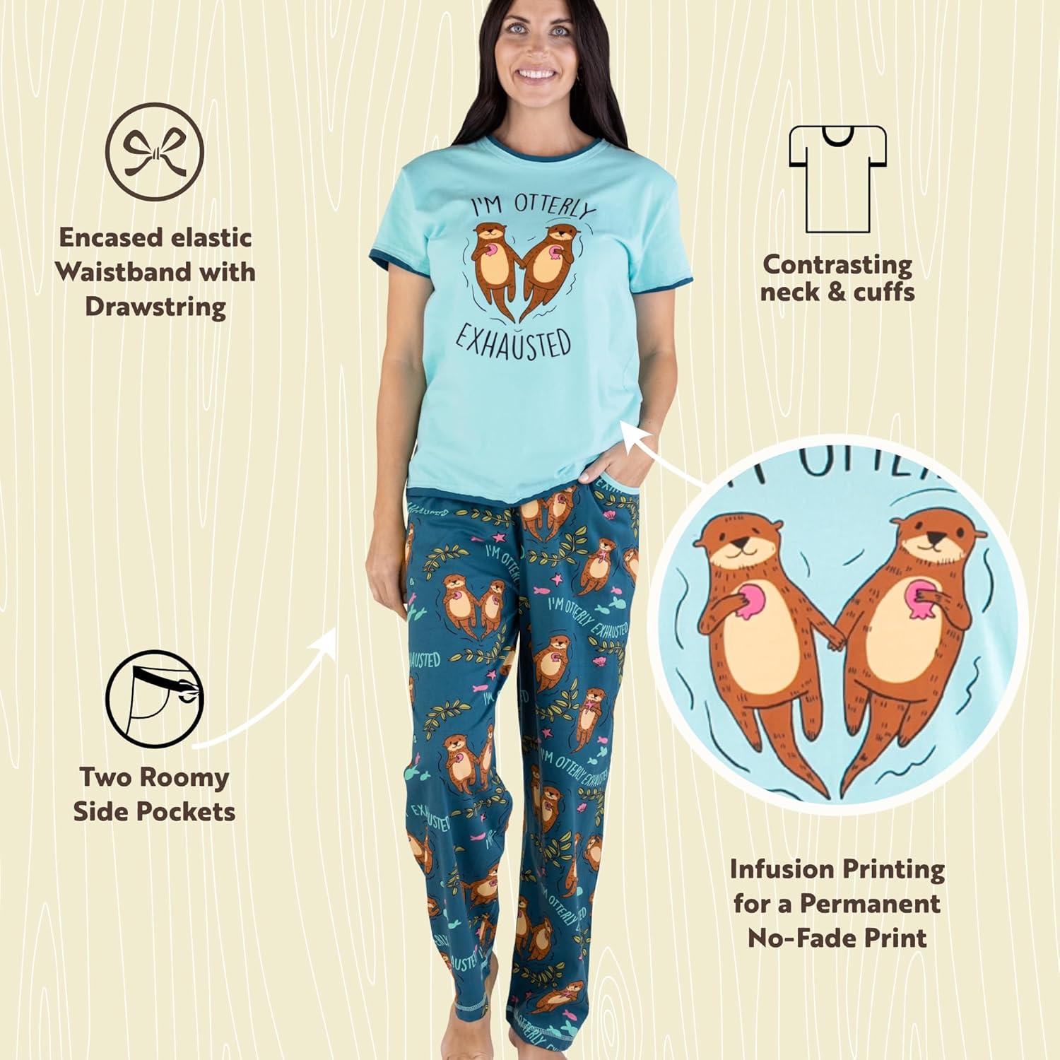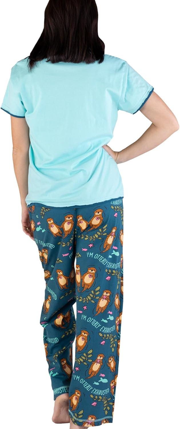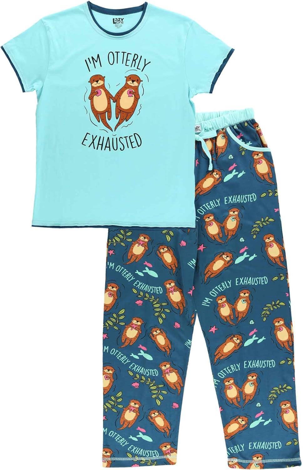 Lazy One Women’s Aquatic Pajama Set – Cute Ocean & Coastal Animal Loungewear for Comfort and Fun(Im Otterly Exhausted Pajama Set)
