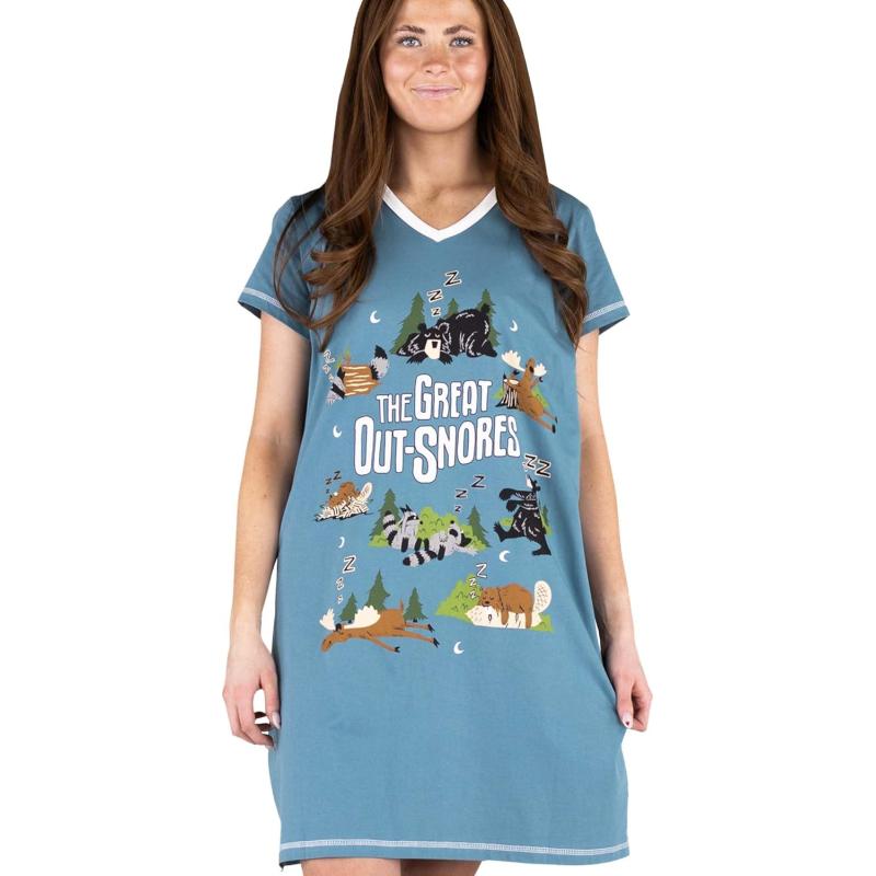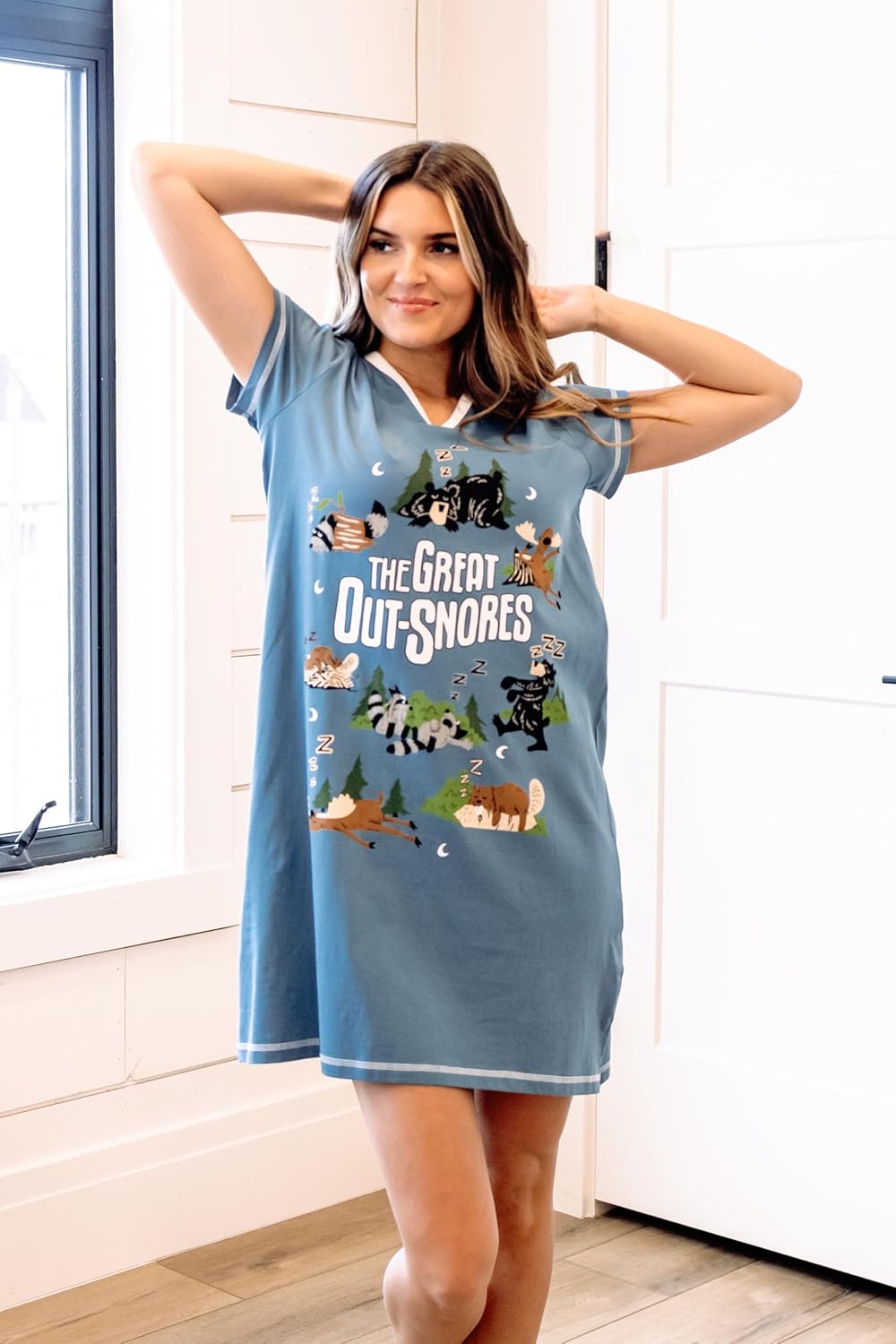 Lazy One Women's Nightgown, Funny V-Neck Sleep Shirt for Women, Bear & Moose Pajama Shirts(Great Out-snores Nightshirt)