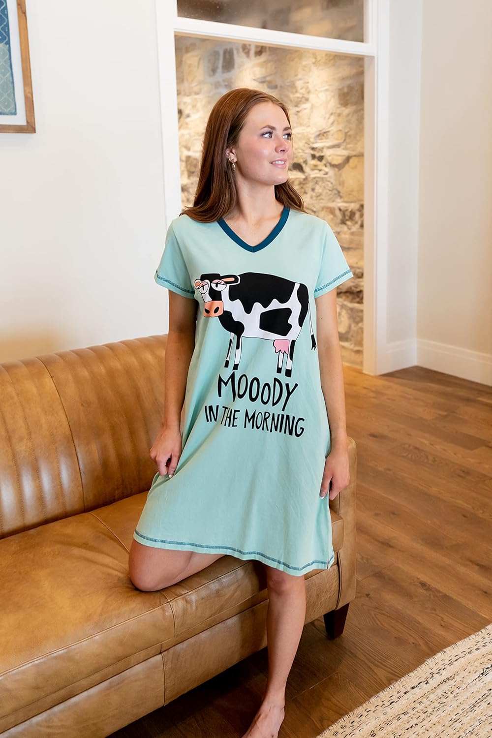 Lazy One Women's Nightgown, Funny V-Neck Sleep Shirt for Women, Novelty Pajama Tees(Moody in the Morning Blue Nightshirt)
