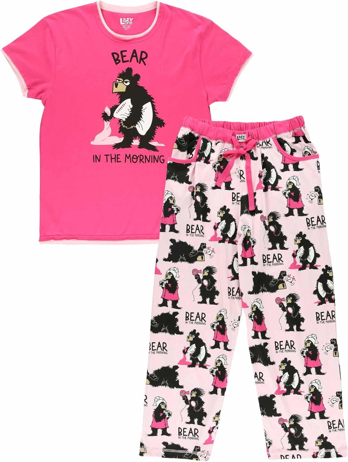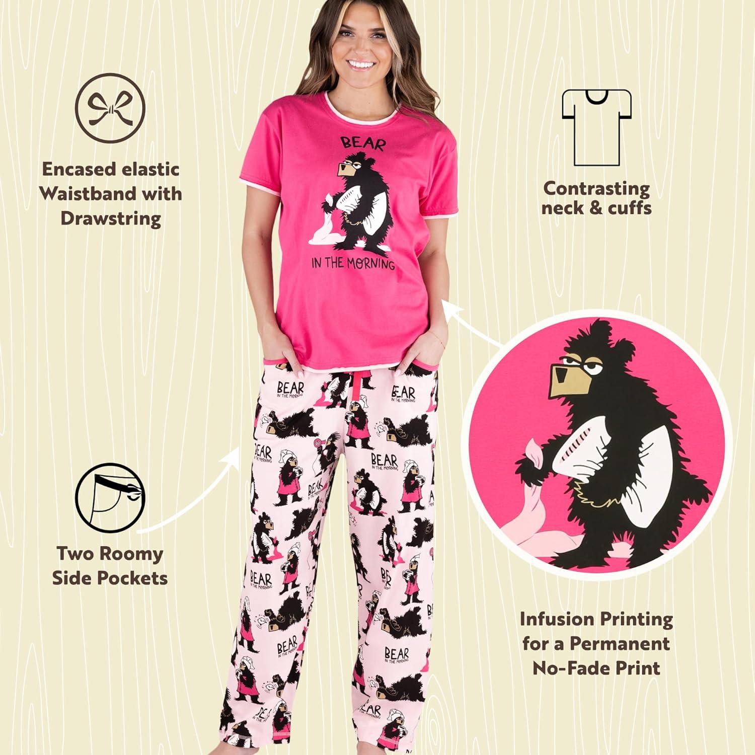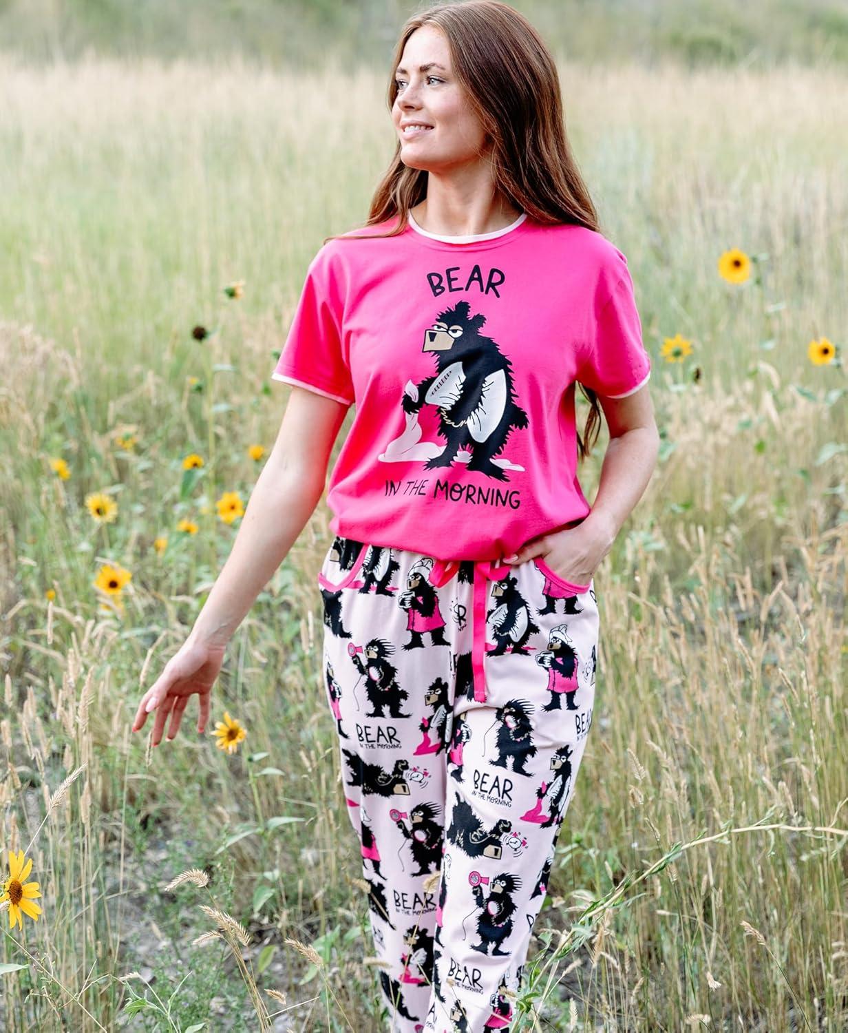 Lazy One Women’s Pajama Set, Short Sleeves with Cute Prints, Relaxed Fit, Bear and Moose Prints(Pink Bear in the Morning Pajama Set)
