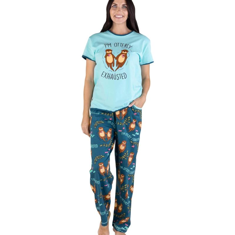 Lazy One Womens Pajama Set Short Sleeves with Cute Prints Relaxed FitIm Otterly Exhausted Pajama Set