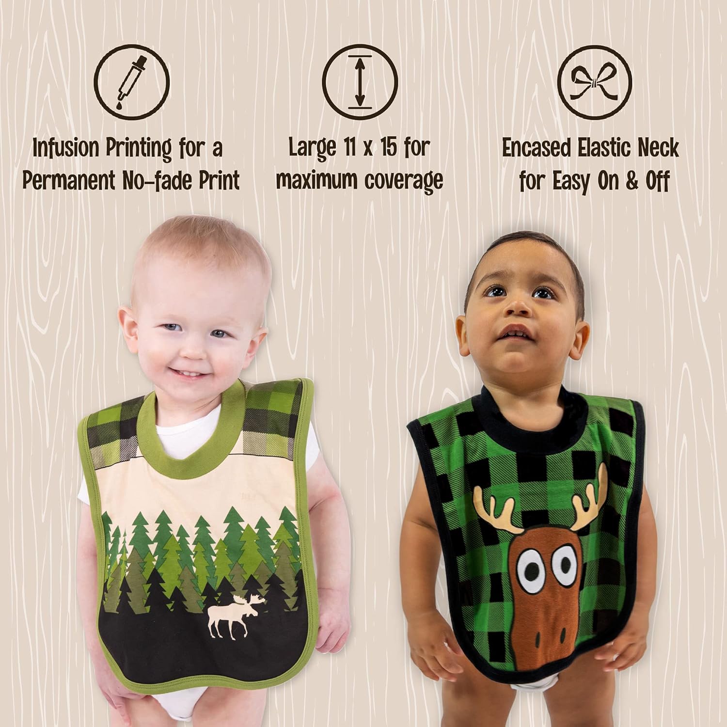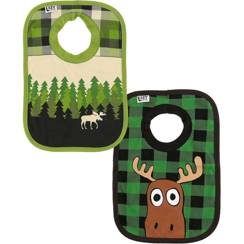 LazyOne Animal-Print Baby Bibs, Infant Bibs, Cute Baby Shower Gifts, One Size, Pack of 2(Moose Plaid and Forest Pack)