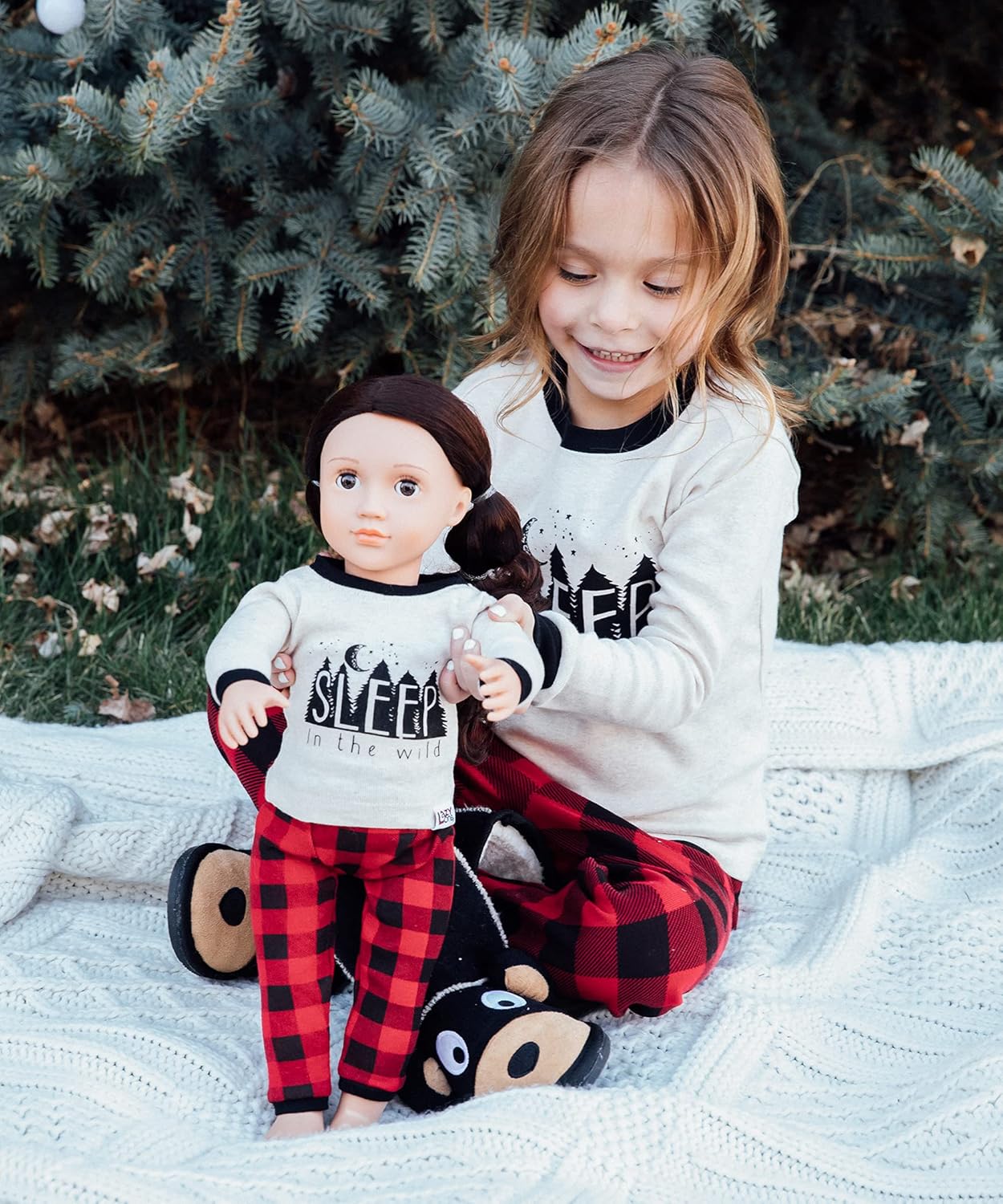 What could be more fun than dressing up in the same outfit as your best friend? These adorable baby-doll clothes match our popular kids pajamas (sold as a set), so your child can be twinsies with their favorite toys. Made for any 18-inch doll, this doll sleepwear is designed to be as durable and soft as our kids’ matching pajamas, so they can be washed and reused for many years. It also comes in the same patterns such as bears, moose, unicorns, or camping as our popular kids pajama separates, so it's easy for kids to pull on and dress their toys themselves. Make bedtime fun and easy by helping your child get their doll ready for bed while they’re getting ready, too. Your child will love dressing their doll in the same soft, cozy, 100% combed cotton with infused ink their own pajamas are made of. And there's a variety of fun designs—from snuggly bear hugs to unicorn rainbow pajamas. Your kids will love how they look, and you'll love how easy it is to tuck them in. Make Christmas morning pictures extra special with amazing matching christmas pajamas or give these pajamas as a gift to help make your child’s first slumber party easier. Dolls not included with purchase. Sized to fit 18-inch dolls, including American Girl, Our Generation, Journey Girl, and more.