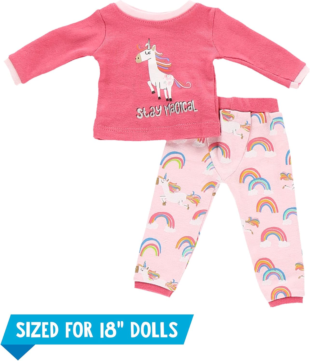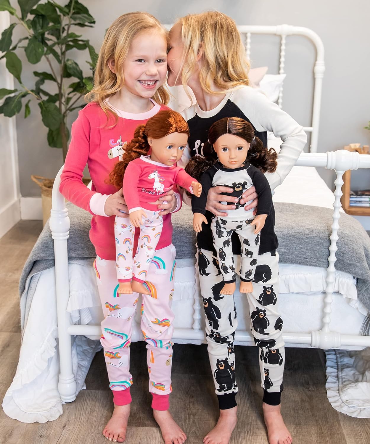 What could be more fun than dressing up in the same outfit as your best friend? These adorable baby-doll clothes match our popular kids pajamas (sold as a set), so your child can be twinsies with their favorite toys. Made for any 18-inch doll, this doll sleepwear is designed to be as durable and soft as our kids’ matching pajamas, so they can be washed and reused for many years. It also comes in the same patterns such as bears, moose, unicorns, or camping as our popular kids pajama separates, so it's easy for kids to pull on and dress their toys themselves. Make bedtime fun and easy by helping your child get their doll ready for bed while they’re getting ready, too. Your child will love dressing their doll in the same soft, cozy, 100% combed cotton with infused ink their own pajamas are made of. And there's a variety of fun designs—from snuggly bear hugs to unicorn rainbow pajamas. Your kids will love how they look, and you'll love how easy it is to tuck them in. Make Christmas morning pictures extra special with amazing matching christmas pajamas or give these pajamas as a gift to help make your child’s first slumber party easier. Dolls not included with purchase. Sized to fit 18-inch dolls, including American Girl, Our Generation, Journey Girl, and more.